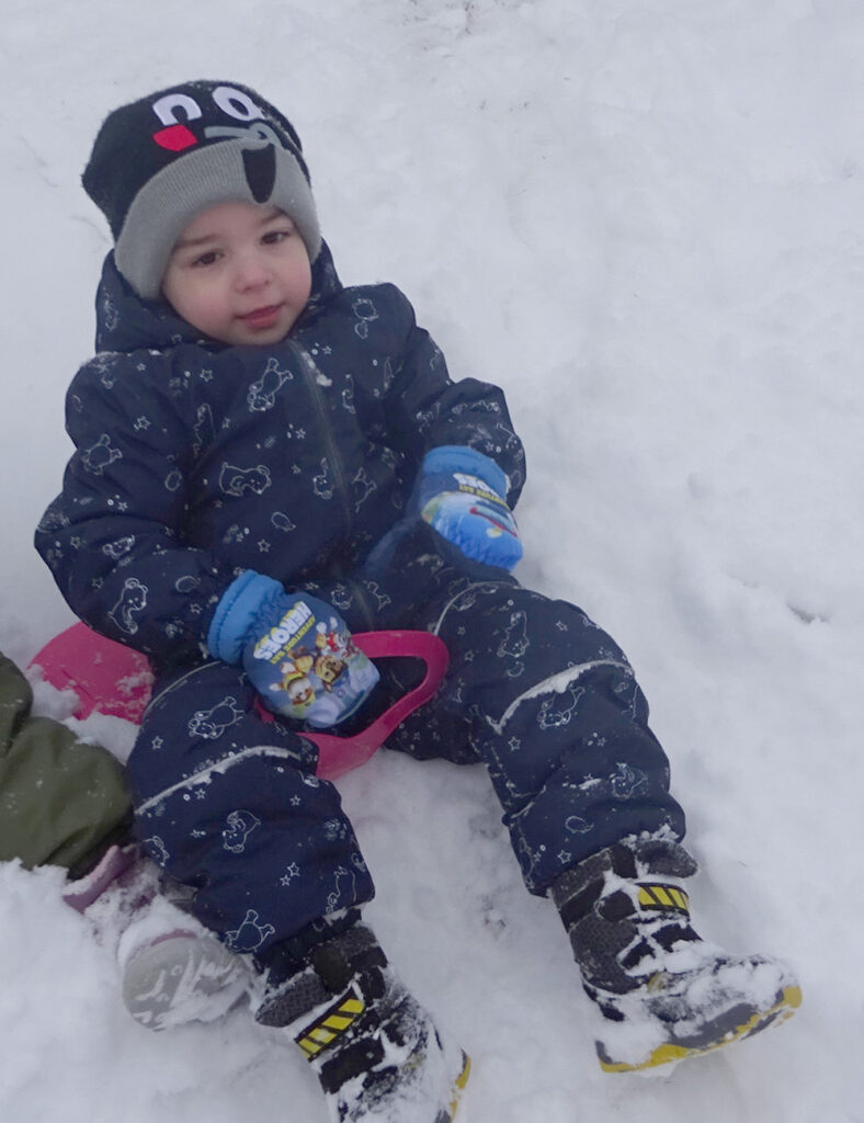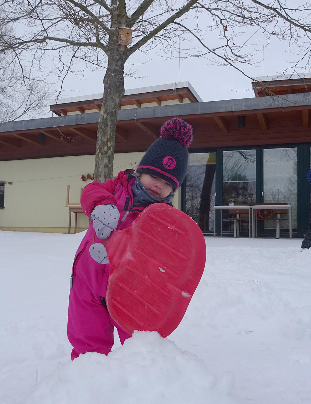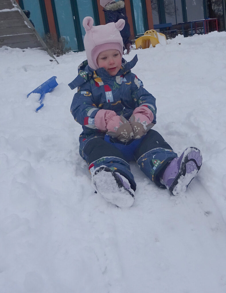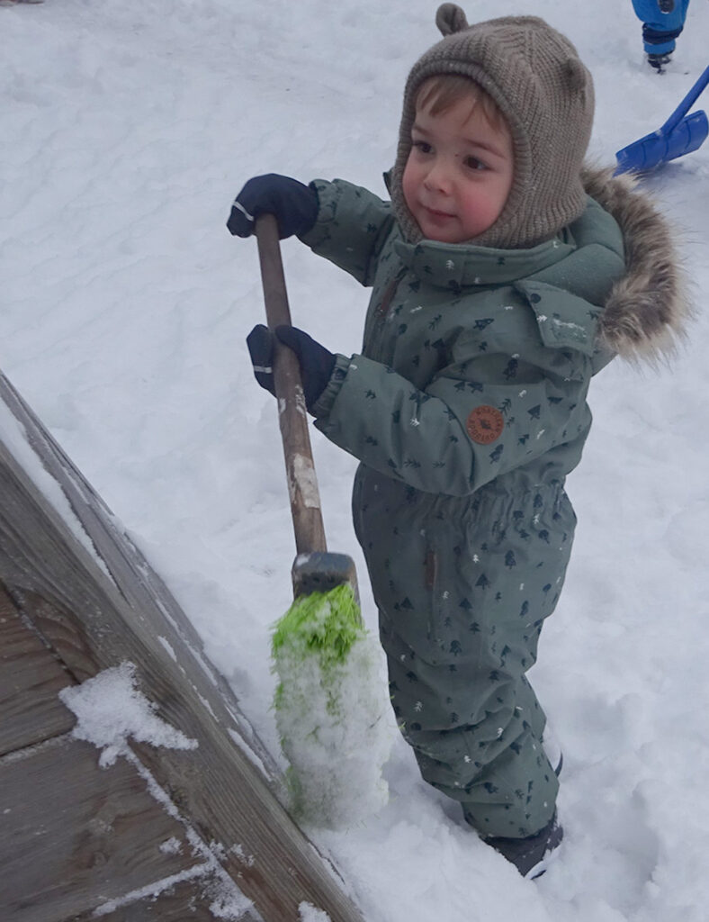 Schnell in den Schneeanzug geschlüpft, Schal, Mütze, Stiefel und Handschuhe an und ab geht es in den Schnee. Mit Straßenbesen und Schneeschippen spielen die Kinder Winterdienst und befreien mit viel Elan und Spaß den Krippengarten von der weißen Pracht.