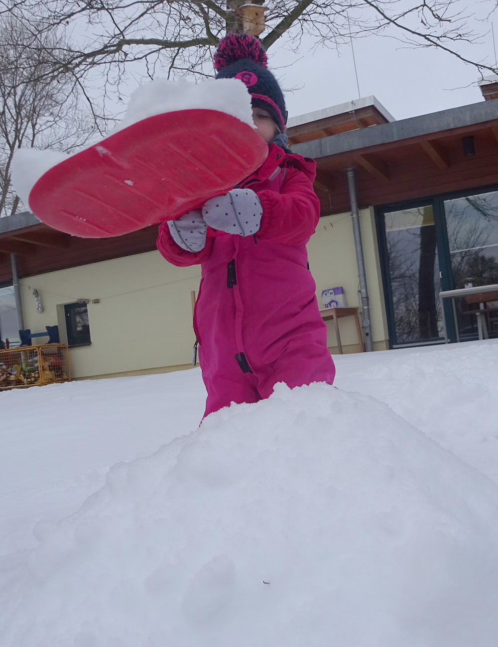 Aus den Schneebergen werden Iglu´s, ein kleiner Rodelhang und Schneemänner gebaut. Anschließend wird der Rodelhang mit den Porutschern eingeweiht, getestet und für „Gut“ empfunden.