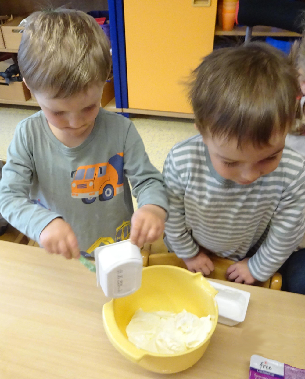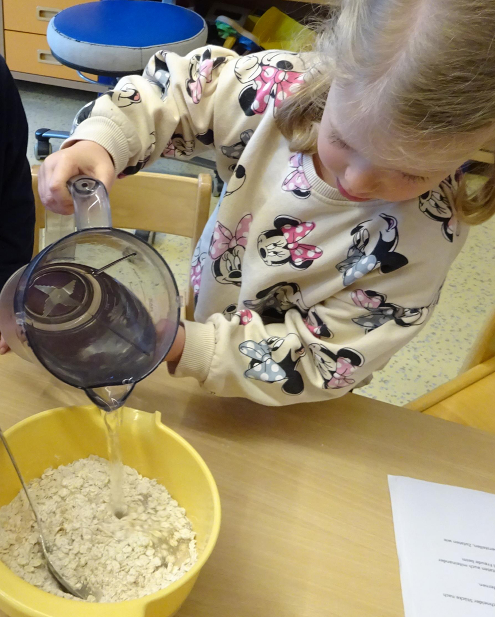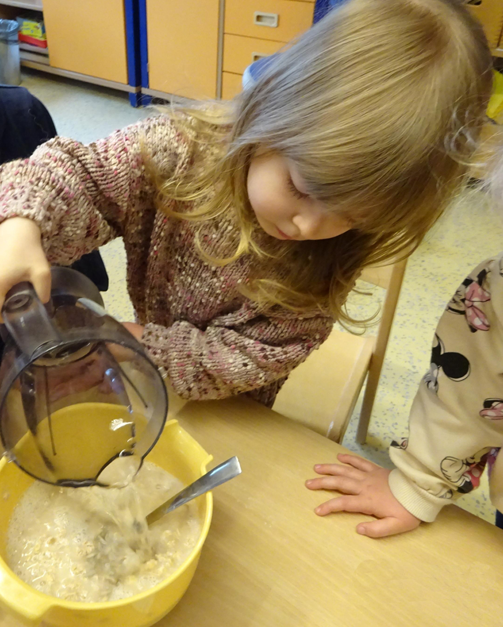 In Vorbereitung auf unsere Kneippwanderung haben wir unser eigenes Knäckebrot gebacken. Aus verschiedenen Körnern und Saaten ist eine leckere und vor allem gesunde Knabberei entstanden. Natürlich darf auch ein passender Belag nicht fehlen. Deshalb stellen wir auch gleich noch einen Kräuter-Knoblauch-Dip her. Bei der Zubereitung von verschiedenen Lebensmitteln, dem Messen und Abwiegen der einzelnen Zutaten, werden die Kinder unter anderem spielerisch an ein erstes Mengen- und Zahlenverständnis herangeführt.