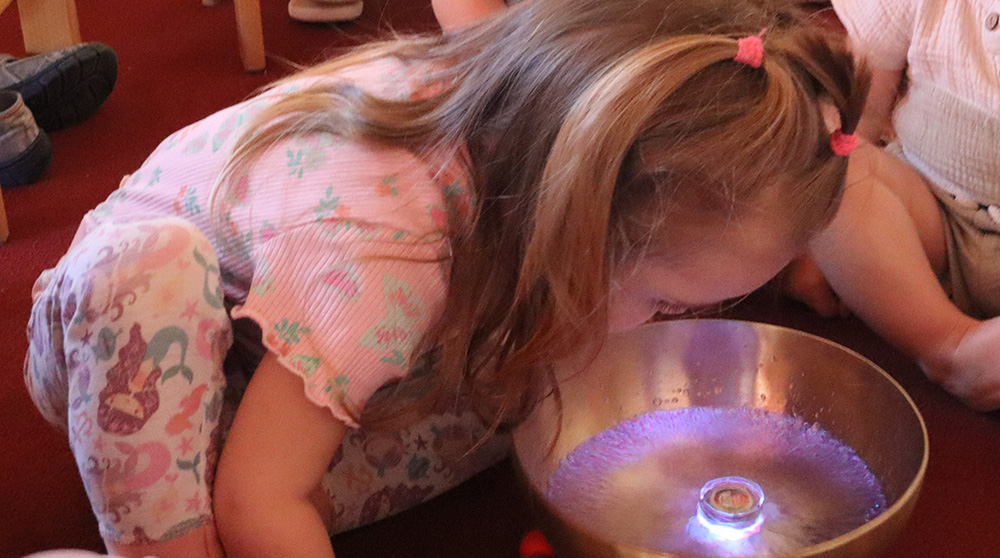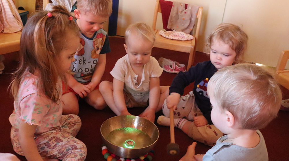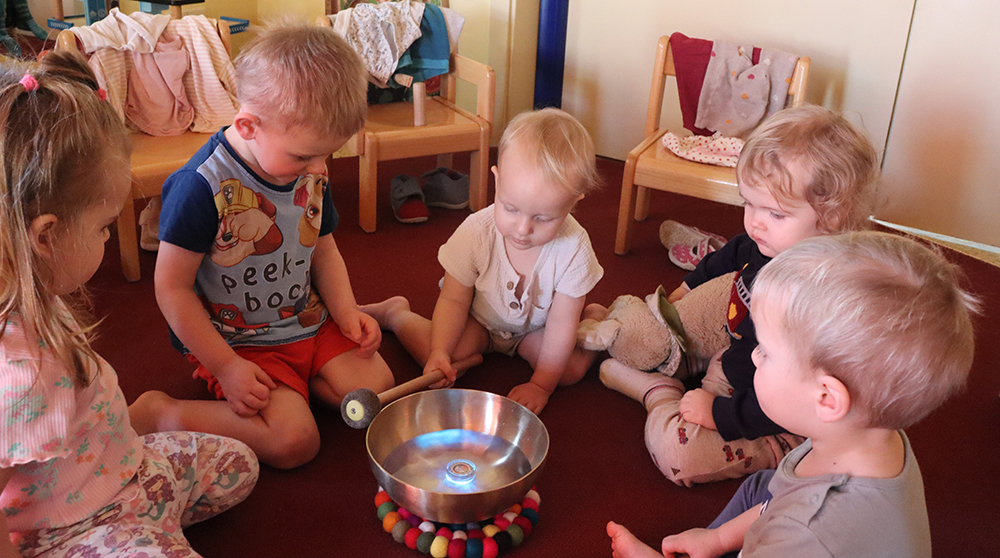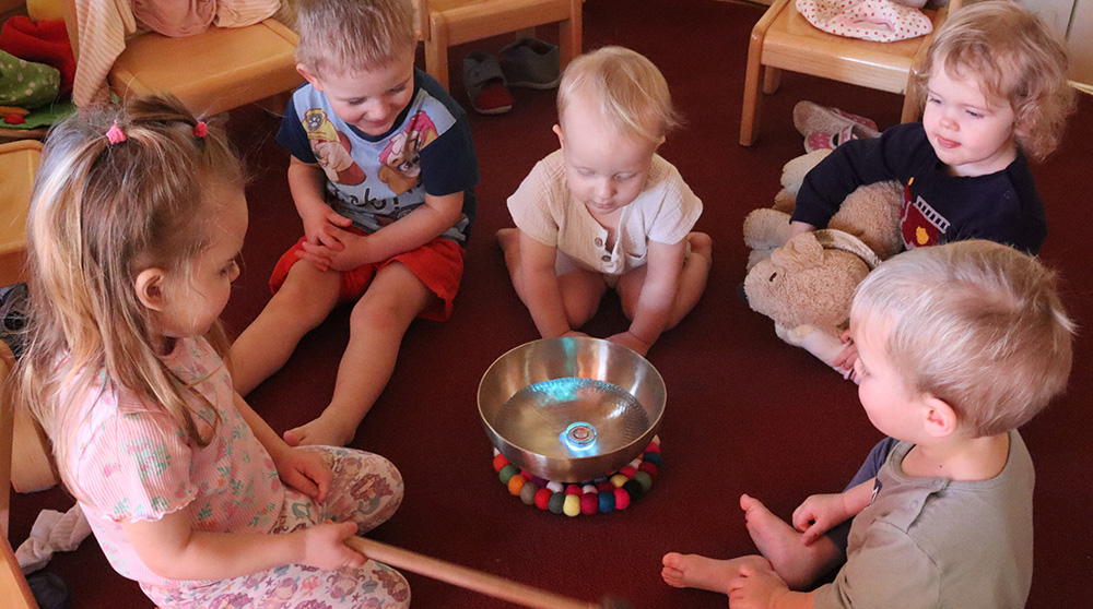 Nach einem aufregenden Vormittag mit pädagogischem Angebot sowie Spielen und Toben wollen wir vor dem Schlafengehen für etwas Entspannung und eine harmonische Atmosphäre sorgen. Dafür holen wir unsere Klangschale, füllen diese mit Wasser und färben es mit Hilfe eines Lichts bunt. Die verschiedenen, sich wechselnden Farben sorgen für Faszination und strahlende Kinderaugen. Reihum darf jedes Kind die Klangschale anschlegeln und den unterschiedlichen Klängen lauschen. Auch schaffen wir es, das Wasser durch die Schwingungen zum Tanzen zu bringen. Die kleinen springenden Wassertropfen sorgen für eine sanfte Gesichtswaschung.